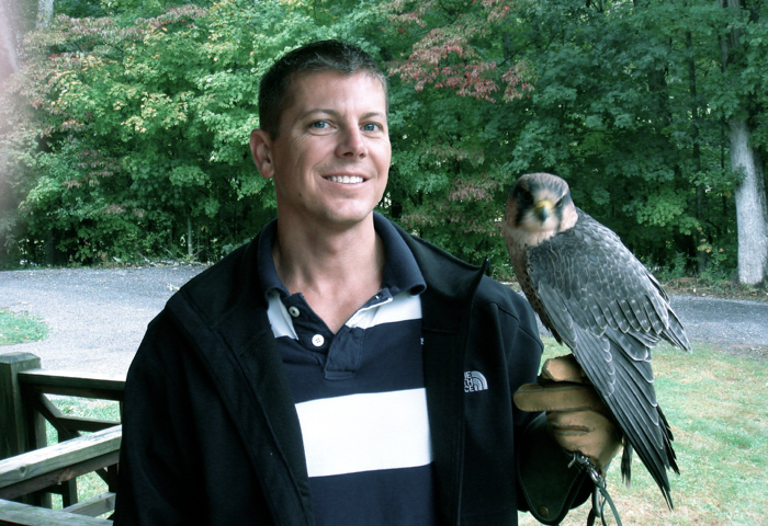First I handled the Peregrine Falcon, which was absolutely beautiful.  This bird was constantly scanning the woods and sky for prey.  It is very difficult to train a falcon as they can get very far very fast.  Then we took a stroll through the woods with a Harris Hawk.  This bird followed us like a puppy dog.  He would often lag behind by 100 yards, we couldn’t see him, but he could see us.  If I put piece of chicken in my glove, he would immediately come and get it, landing on my hand and eating with a protective posture so that other animals could not see his meal.  The hawk did get a bit spooked by horses that we passed, but the horses were equally scared, perhaps more so.  When we got back, the Hawk would catch meat thrown into the air, land and eat it.  I was also introduced to several other birds including an owl with amazing orange eyes.