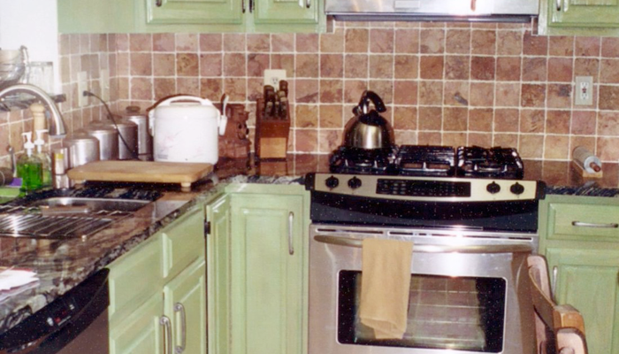 This spring, I remodeled the entire kitchen. The basic layout was kept in tact, but virtually everything was redone. The wood floor was ripped up, underlayment put down followed by a tumbled stone grouted with off white, which was also done in the entry hall. New baseboard trim was put all around. The cabinets were stripped and then refinished with a light green stain and 3-4 layers of polyurethane. New cabinets for under the center island were given the same treatment. The hinges and handles were swapped out for nicer hardware. The sink and faucet were replaced and the counter tops were replaced with a custom granite. All the appliances were also replaced. The backsplash was tiled with a 4” version of the floor tumbled stone. All the work was done by me, except the countertops which were completed by a contractor, saving many thousands. It truly is amazing what you can accomplish if you just try. It is now a designers dream kitchen, so I thought I’d post some before/after pictures.