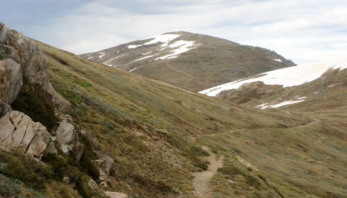 I had 2 days to summit in case bad weather came in. The weather forecast was for thunderstorms in the afternoon of both days. I got to bed early and got up early and grabbed breakfast. I packed lunch, 2L gatorade, 1L water, a fleece, hat, gloves and rain gear in a daypack and drove up to Charlotte Pass. This gave me ample water and gear in case of weather; those wanting to save pounds can get away with 1L and rain gear only. This mountain is supposed to be easy, so I opted for the longest way to the top on the Main Range Track and return by the Summit Trail, about 22k roundtrip. I saw only a few people on the Main Range Track, but it has good views of Kosciuszko. The Summit Trail really has no good view of the mountain at all. I can’t comment personally about the third and easiest trail, the Kosciuszko Walk, from the top of a chairlift in Thredbo, but people who took this trail said it took less than 2 hours hiking. The Main Range Track was mostly just nice trekking. On the final ridge I ran into many snowfields, one with a crevasse, which I avoided by climbing up to solid ground above it. At one point I came to a 15-foot wall of snow with a steep drop below. I just kicked in steps and climbed up. Later I met some people who were watching me from across the valley on the Summit Trail who wondered where my climbing partner was (and also what I was doing “way over there”). There were some boy scouts camping in the valley and I can only wonder what they were thinking. The flies were still bothersome almost all the way to the top, even on the snowfields. I got to the summit at around 10:30am after 3.5 hours and stayed there for over an hour for pictures and lunch. There I met a group raising money for charity who had cycled from the coast up the mountain (as far as they could) and then ran the rest of the way. I lent a fleece to one of the cyclists on the summit while we chatted. I walked back down with their support crew, Larissa and her friend, who had hiked up from Charlotte pass on the Summit Trail. The trek down the Summit Trail took less than 2 hours and the flies were even worse. Black thunderheads were forming over the mountain and you could hear the thunder, but as we were reaching the parking lot there were still groups heading up.